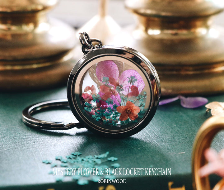 " December Collection's " Mystery Flower Design, Black Locket Keychain, Robinwood