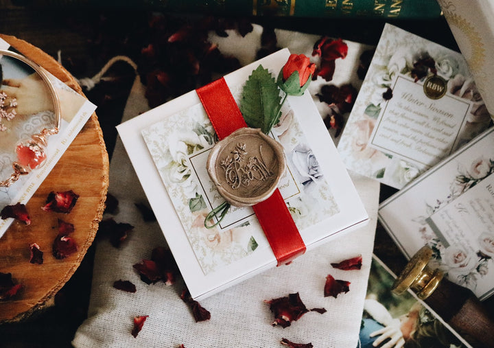 Every order include Elegant Gold wax seal stamp gift box with vine ribbon color