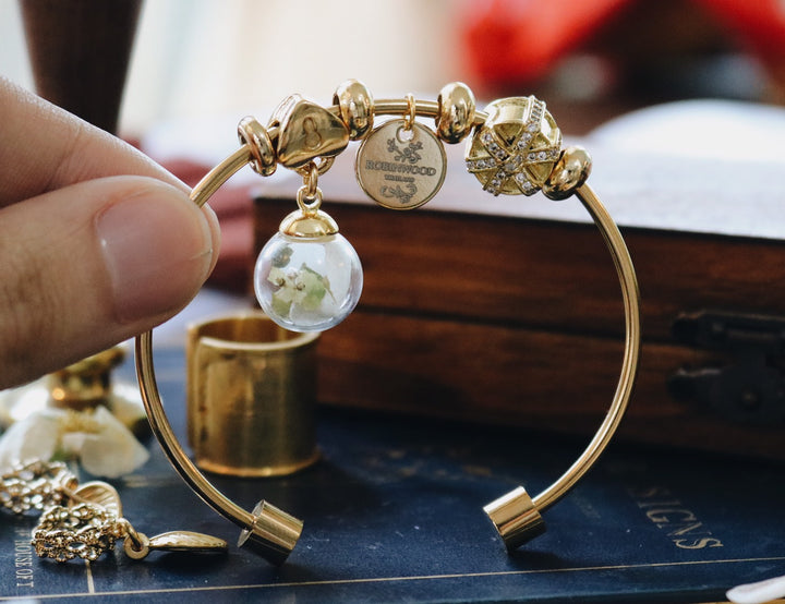 Robinwood Story : This is the newest version of original Gold bracelet with Gold Box totem & Key Heart totem with the Flower design, Green Ever Garden Rare Custom flower from north Germaby to our design on the bottom of the bracelet, we use 92.5 K silver with gold with good quality handmade for you.