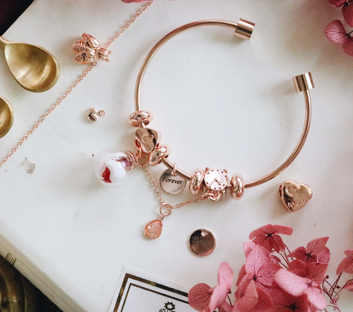 Robinwood Story : This is the newest version of original Rosegold bracelet with bee totem & Key Heart totem with the Flower design, Violet bloom and white lily flower design on the bottom of the bracelet, we use 92.5 K silver with gold and coppper to mantain the beautiful color of rosegold with good quality handmade for you.